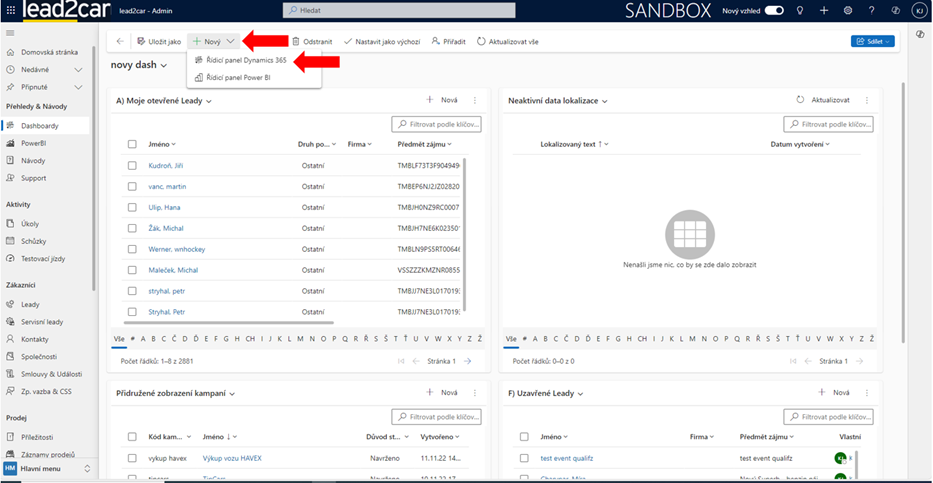 Nejprve se přihlaste do Lead2Car pomocí svých přihlašovacích údajů. Po přihlášení přejděte do záložky "Dashboardy". Pro vytvoření nového dashboardu klikněte na tlačítko "Nový" a vyberte možnost "Řídící panel Dynamics 365".