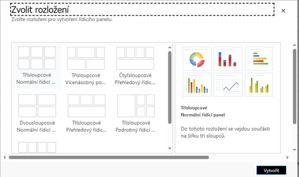 Otevře se nové okno s tabulkou, kde si můžete vybrat uspořádání dashboardu. Například vyberte uspořádání se čtyřmi sekcemi a klikněte na "Vytvořit".