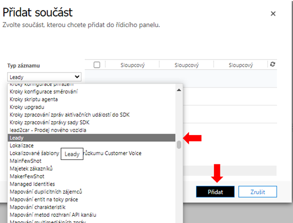 Otevře se další tabulka, kde v typu záznamu vyberte entitu, což je položka v levém šedivém menu, kterou budete chtít přidat do dashboardu (například "Leady", "Úkoly", "Testovací jízdy" nebo "Schůzky").