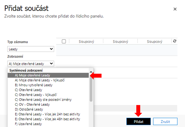 Pokud začnete psát název entity, automaticky se vám nabídne relevantní výběr, což usnadňuje hledání a přidávání. Pro každou sekci vyberte zobrazení, například "Moje otevřené leady" nebo "Moje nedokončené úkoly", a klikněte na "Přidat". Tento postup opakujte pro všechny sekce, které chcete do dashboardu přidat.