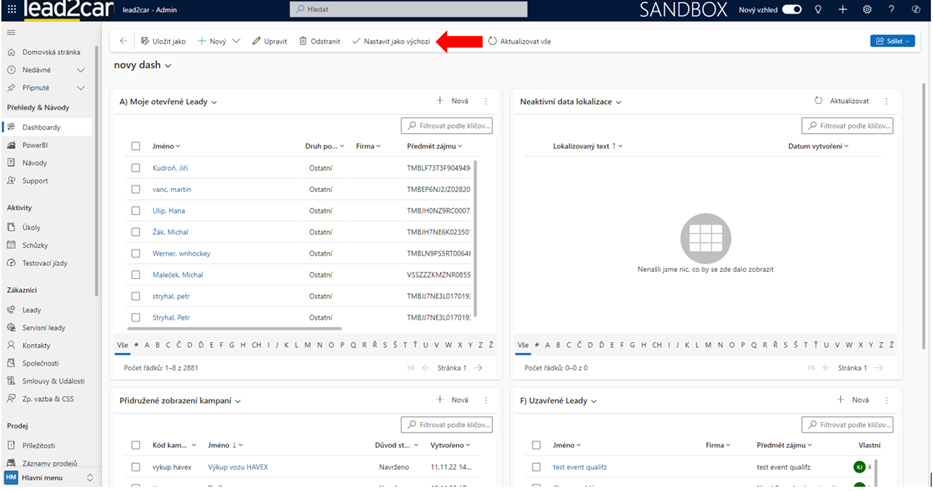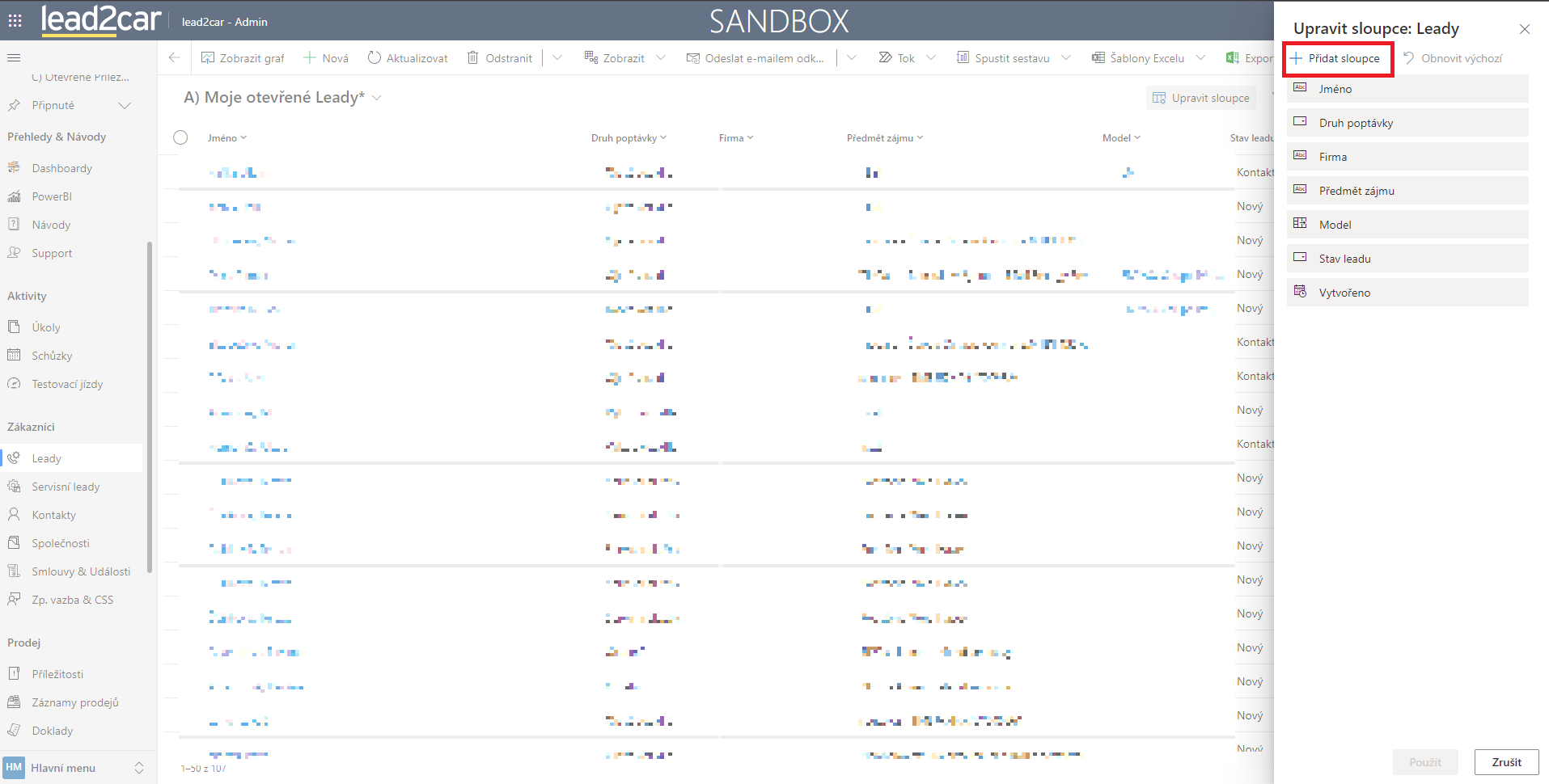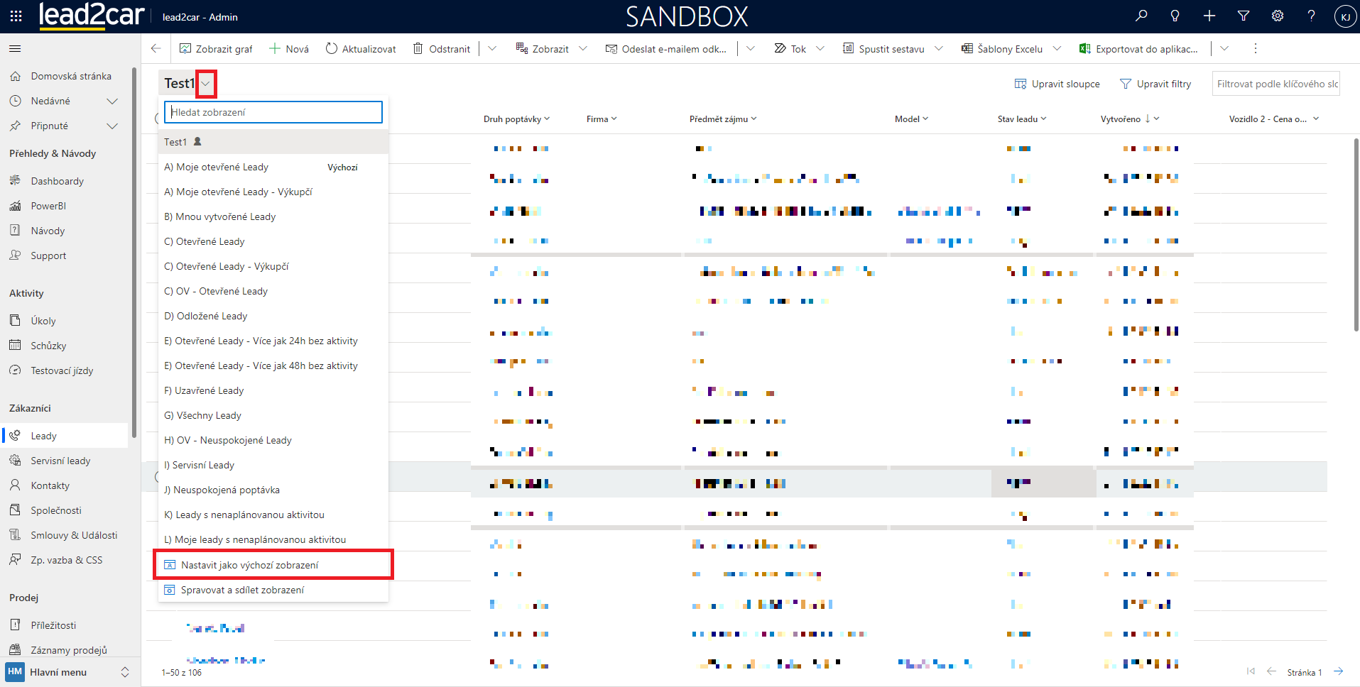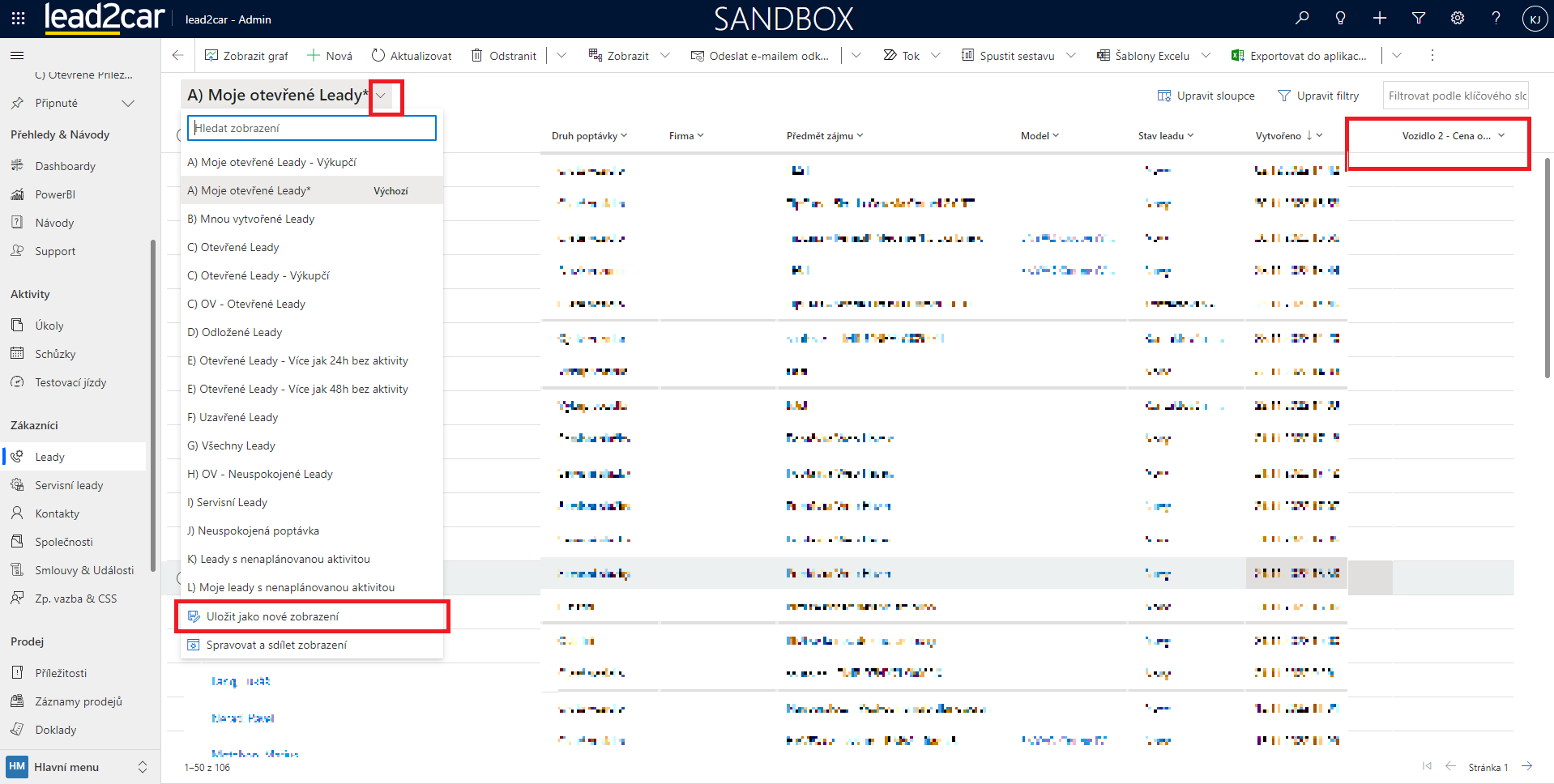 Vlastní zobrazení lze vytvořit na základě jakéhokoliv již existujícího zobrazení v Lead2Car. V tomto návodu budou za účelem tvorby vlastního zobrazení využity A) Moje otevřené Leady.