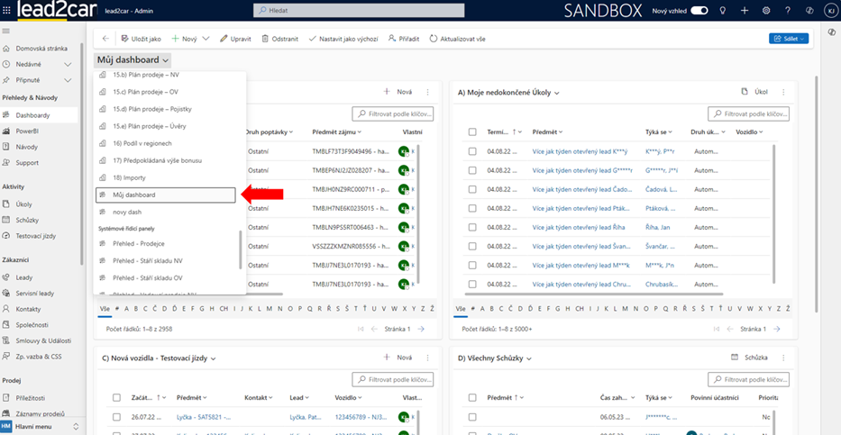 Dashboardy v Lead2Car jsou připravené pro různé role jako například prodejce, vedoucí prodeje nebo zákaznické centrum. Pokud vám však nevyhovuje, jak jsou zobrazení uspořádána nebo jaké komponenty jsou vybrány, můžete si vytvořit vlastní dashboard a přizpůsobit jej svým potřebám.
