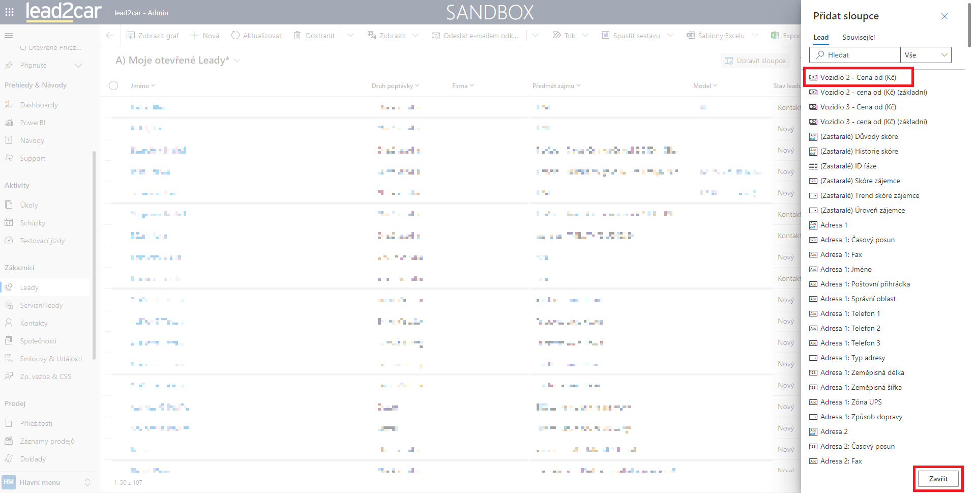 Kliknutím na daný název sloupce zmizí z dostupných možností. V tomto případě byl zvolen sloupec Vozidlo 2 – Cena od (Kč). Po přidání zvolených polí klikneme na tlačítko Zavřít.
