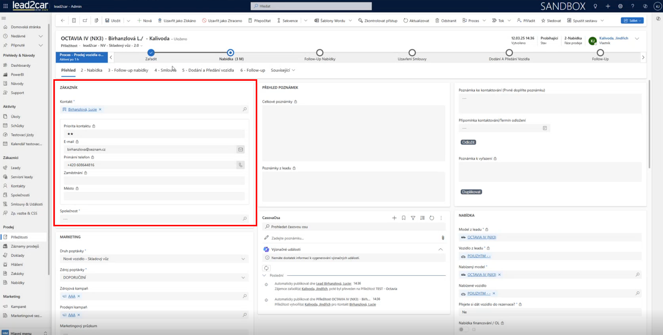 Na hlavní záložce "Přehled" najdete klíčové informace o zákazníkovi, včetně kontaktů. V této části lze také pracovat se zdrojem poptávky a naplánovat testovací jízdu. Dále zde můžete nastavit tzv. Hlídací pes, který sleduje specifické požadavky zákazníka a upozorní vás, jakmile se objeví odpovídající vozidlo.