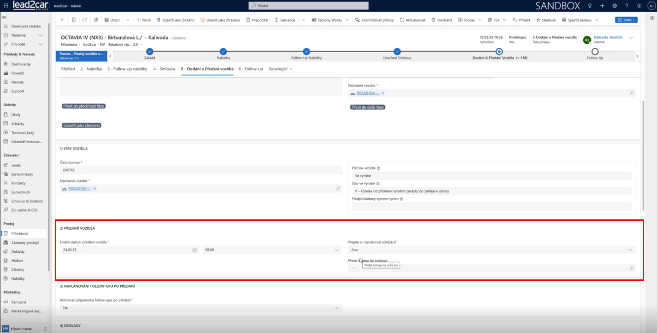V části určené pro předání vozidla můžete naplánovat konkrétní termín schůzky se zákazníkem. Pokud máte Lead2Car propojený s Outlookem, schůzka se automaticky uloží do kalendáře a zákazník obdrží pozvánku e-mailem.