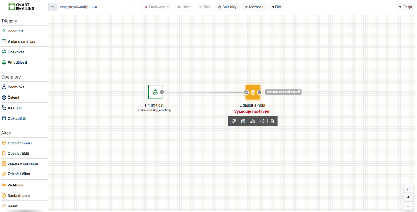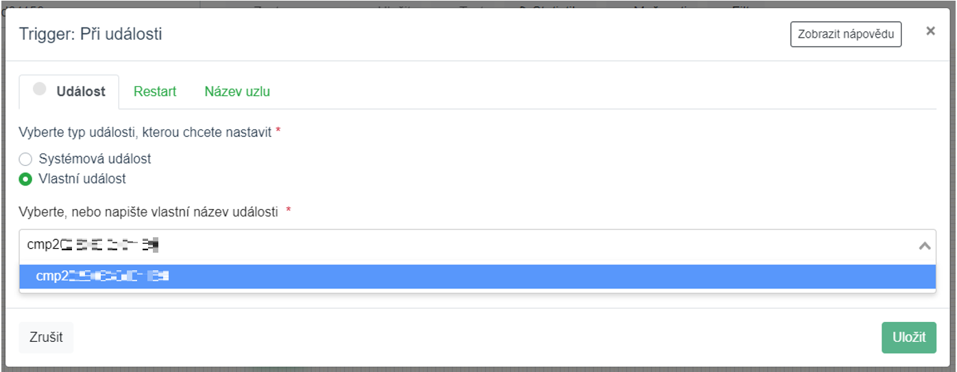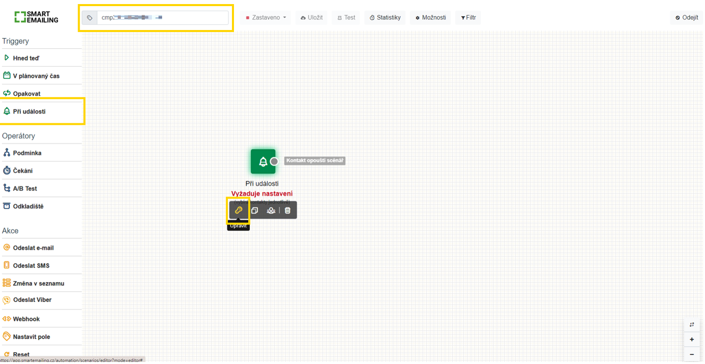 Vlevo v menu tedy vybereme trigger „Při události“ a přetáhneme ho myší do prostoru. Pomocí ikonky klíče tento uzel nastavíme.
