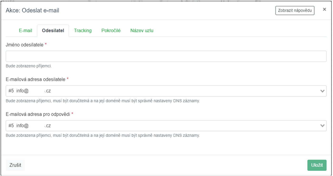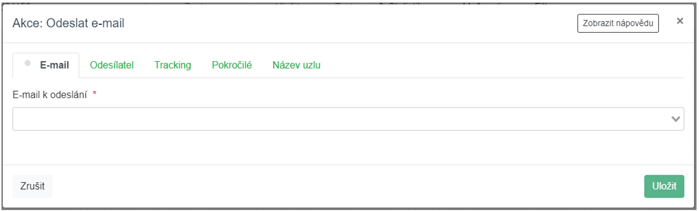 Pomocí ikonky klíče je nyní opět třeba nastavit nový uzel. V záložce e-mail je třeba vybrat daný připravený e-mail, který bude odeslán na příjemce.