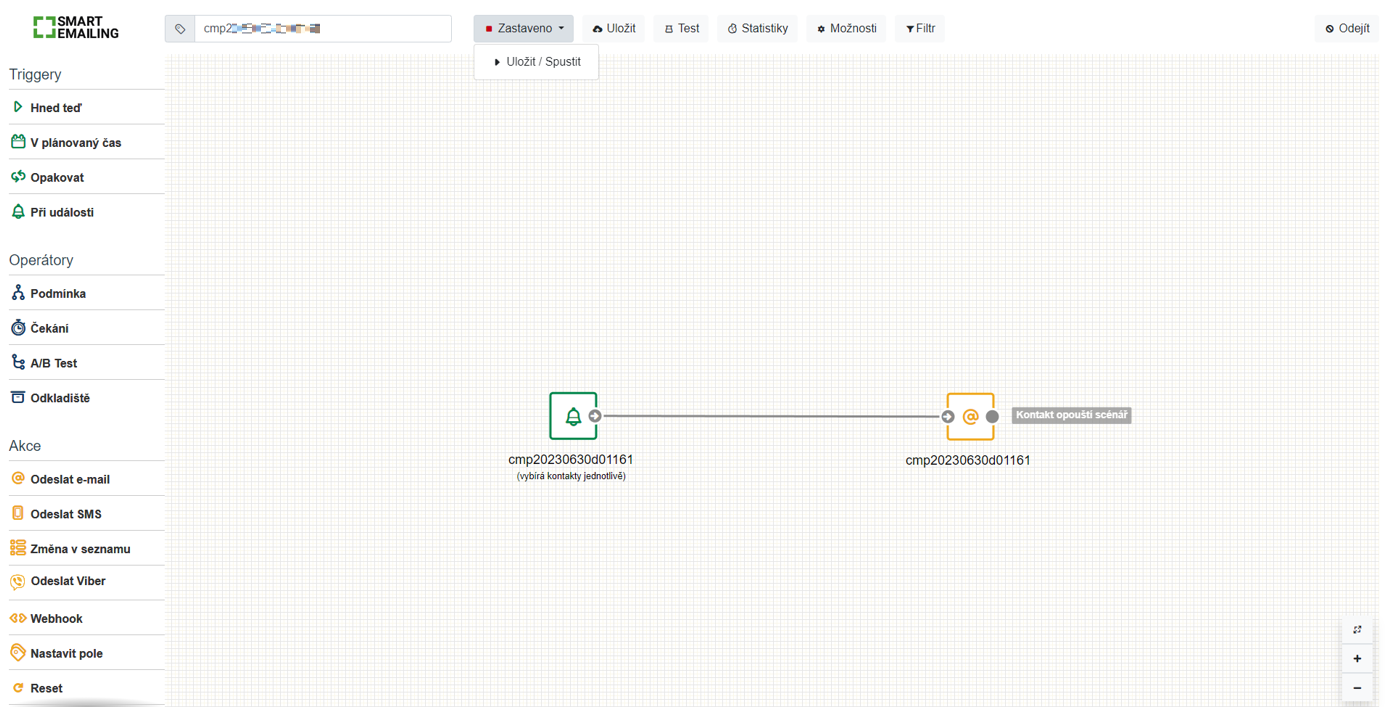 Momentálně jsme dokončili nastavení základního scénáře, který nám umožní odeslat hromadný e-mail na námi zvolený marketingový seznam. Vedle Názvu scénáře zvolíme možnost Uložit/Spustit.