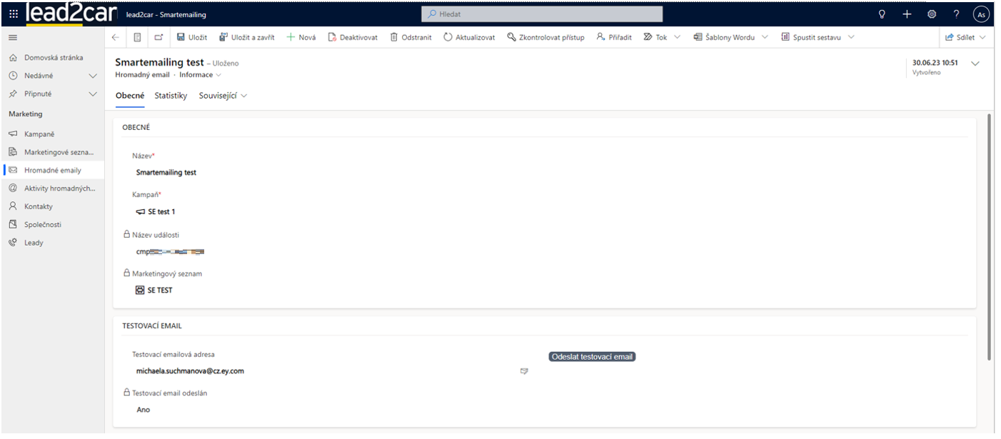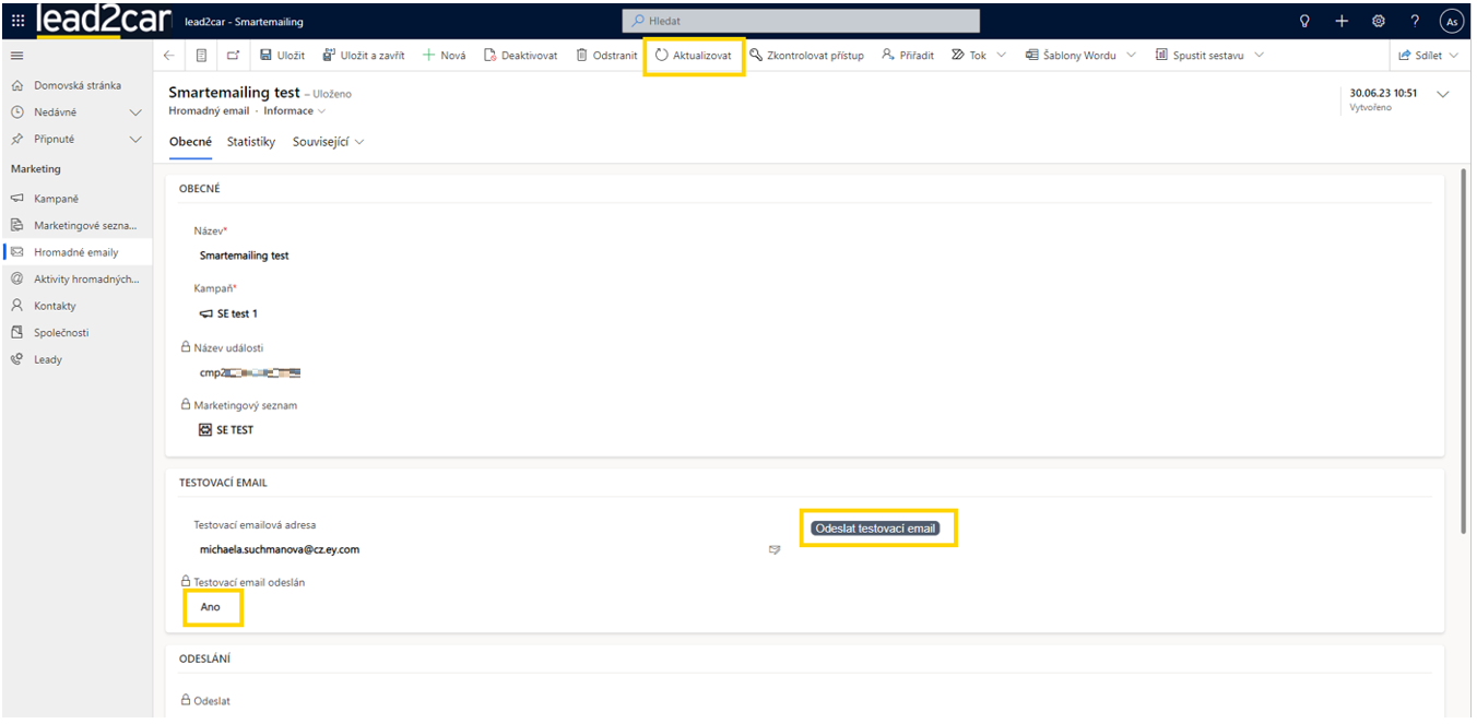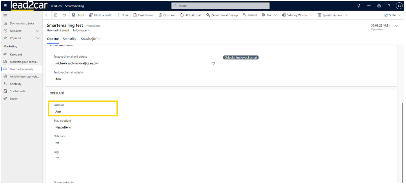 Stav odeslání lze sledovat jak ve scénáři ve Smartemailingu, tak v lead2car v poli „Stav odeslání“. Jakmile bude e-mail rozeslán na všechny kontakty v marketingovém seznamu, objeví se v poli „Odesláno“ Ano.