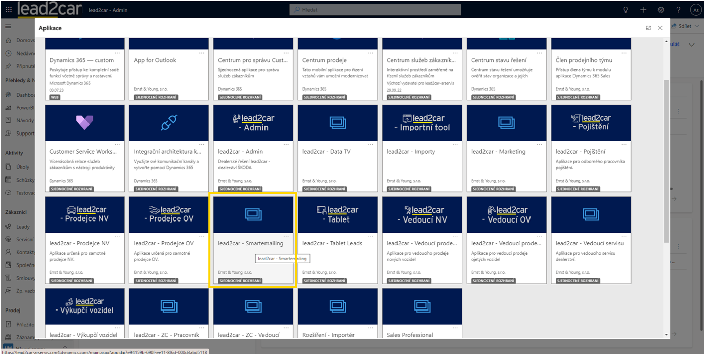 Následně je třeba vybrat dlaždici s názvem lead2car – Smartemailing.