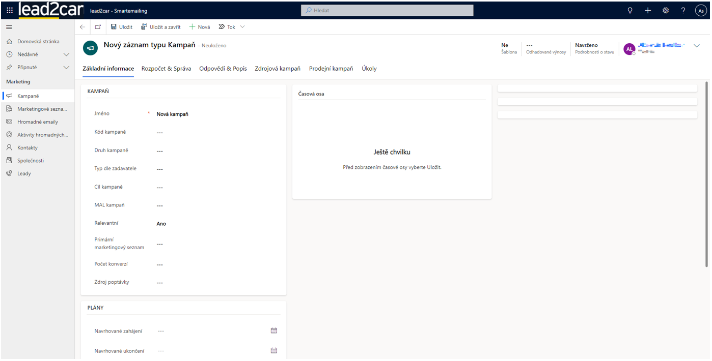 Ve formuláři pro vytvoření nové kampaně je třeba vyplnit především její název. Ostatní pole sice nejsou povinná, nicméně je vhodné vyplnit o kampani co nejvíce informací, pro lepší orientaci v kampaních v budoucnu.