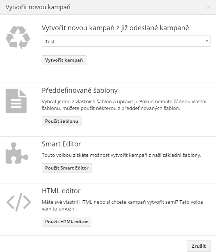 Pomocí tlačítka „Vytvořit nový e-mail“ v levé horní části obrazovky se dostaneme na výběr způsobu tvorby nového e-mailu. Zde budete pravděpodobně využívat Smart editor, kde je možné vybrat z předdefinovaných šablon, které si lze libovolně upravit, nebo HTML editor, kam lze jednoduše zkopírovat již připravený e-mail pomocí html kódu.