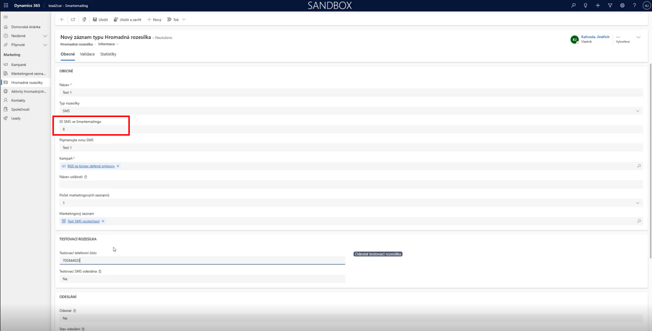Poté hromadnou rozesílku uložte. Dále zadejte testovací telefonní číslo a odešlete si zkušební SMS zprávu pro ověření správnosti.