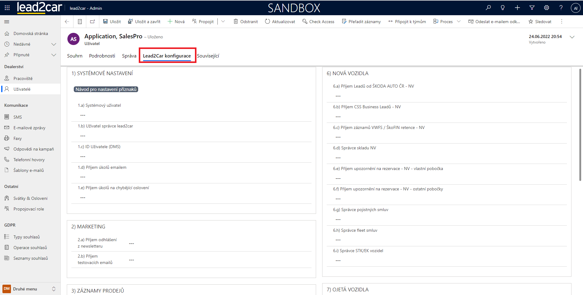 V jeho kartě pouze zvolte z panelu nahoře možnost "Lead2Car konfigurace", a zde již můžete upravovat příznaky. Následuje popis jednotlivých akcí a pravomocí pro jednotlivé příznaky.