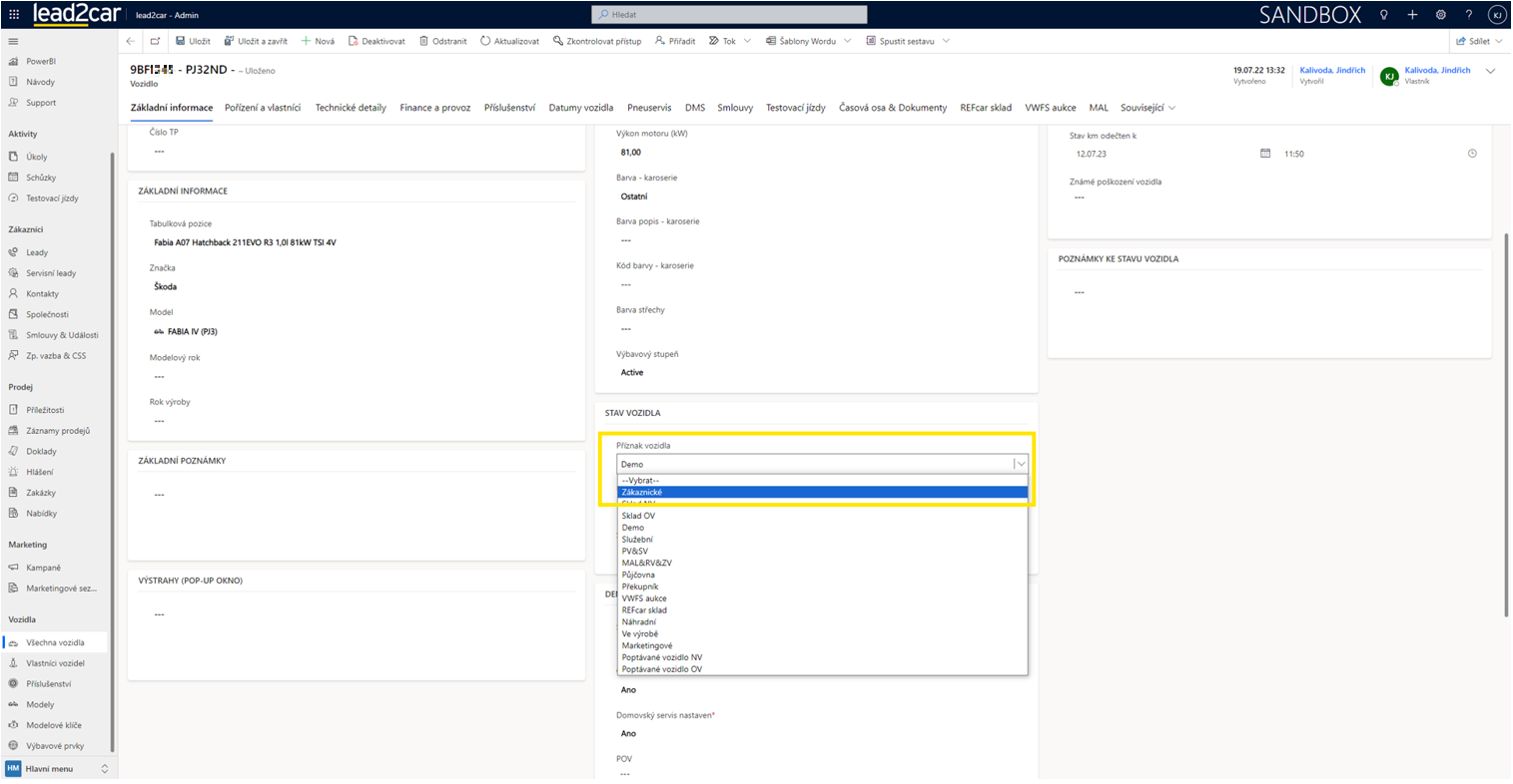 Pokud se ve formuláři posuneme o něco níže, uvidíme sekci Stav vozidla. Zde je třeba v poli Příznak vozidla změnit aktuální příznak na „Zákaznické“.