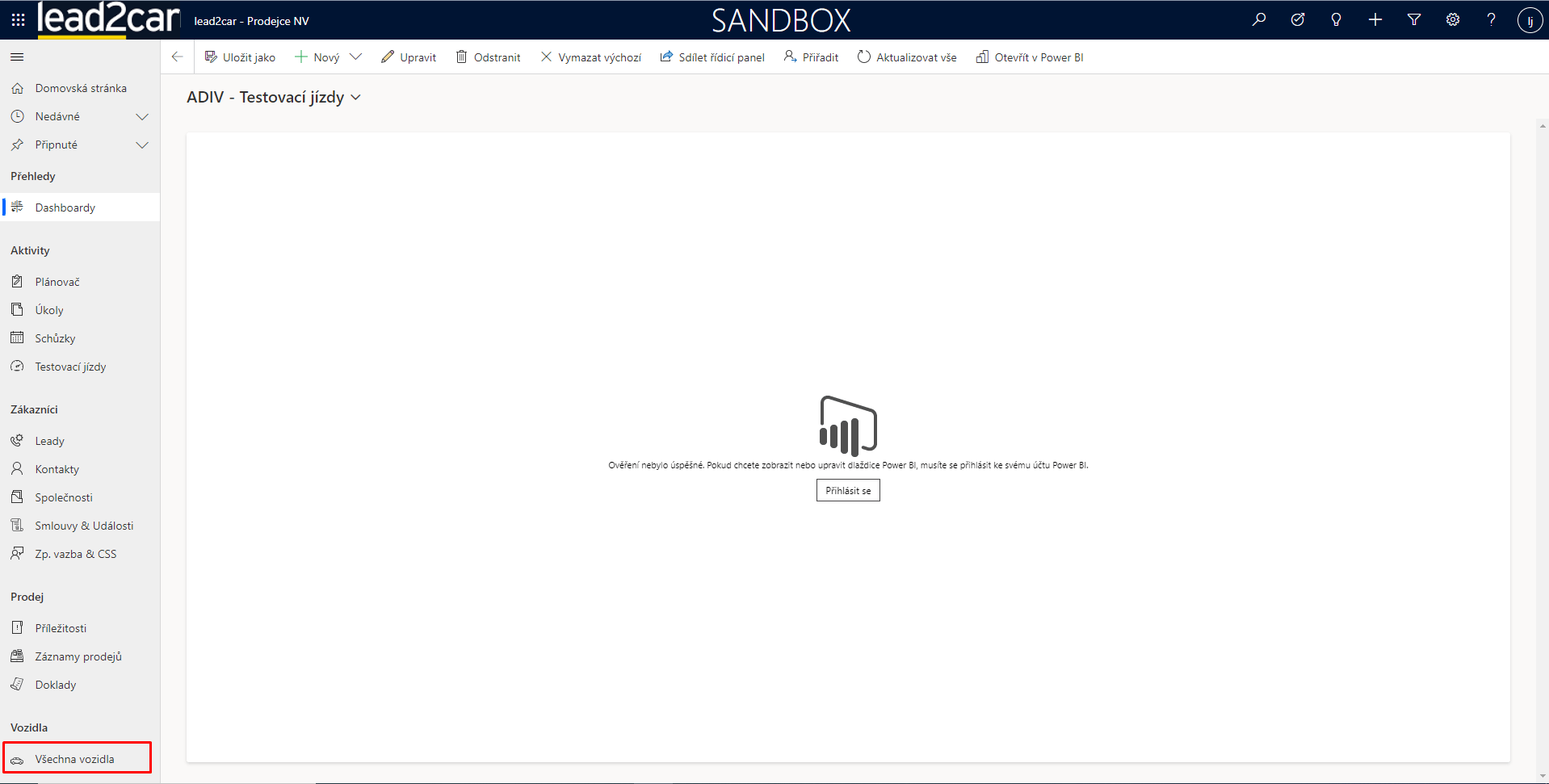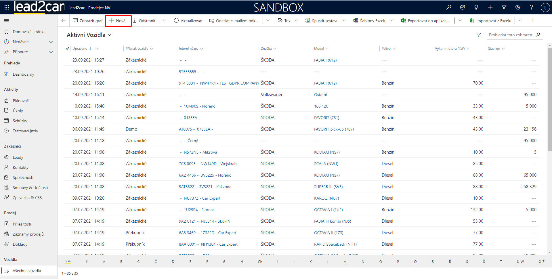 Údaje o vozidlech se v lead2car zadávají ručně. Pro vytvoření záznamu o vozidle vyberte z levého menu možnost „Všechna vozidla“. Následně bude zobrazen celý seznam vozidel.